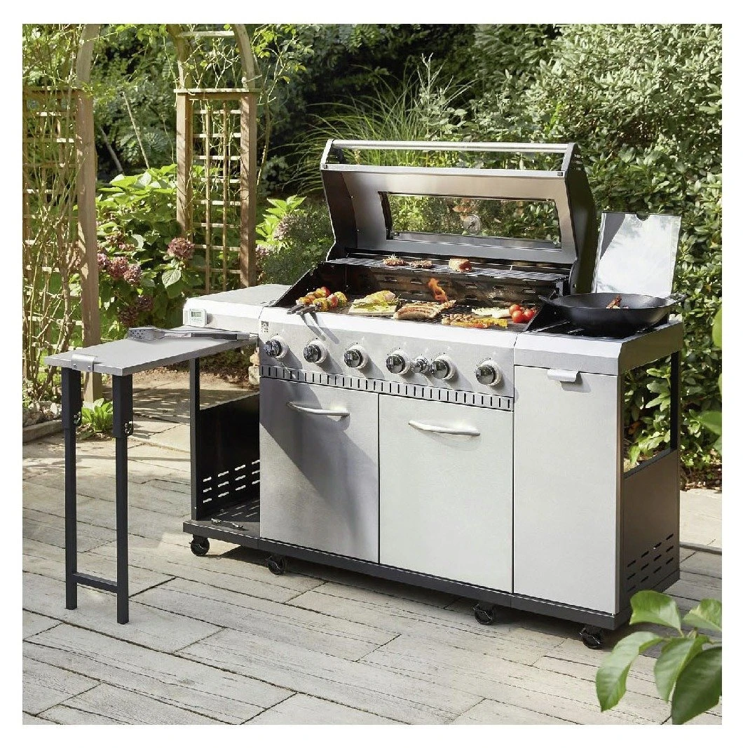 Gas BBQ with 6 x 3.5kW adjustable stainless-steel burners with automatic ignition; complete with 1 x 3.0kW side burner with automatic ignition, Enamel coated steel warming rack (92 x 15cm). Double skinned hood with built in thermometer for monitoring the temperature in the cooking chamber. Includes a foldable table to give the chef a larger area for preparing food, storing utensils & cooking equipment LED illuminated control knobs. 3 base cabinets for space-saving storage and 8 swivel and lockable castors for easy movement.